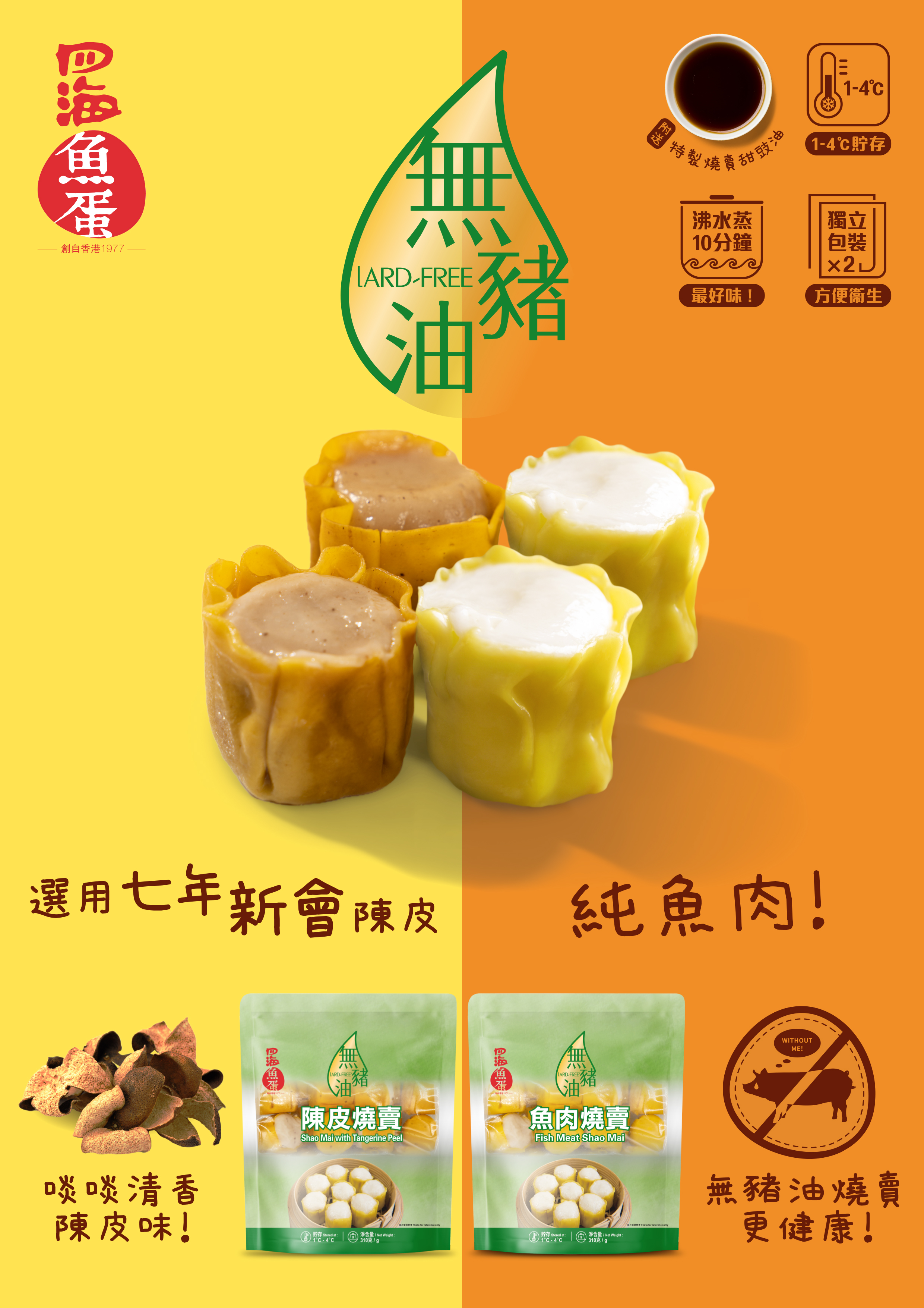 Shaomai is featured with chewy and strong fish flavour. No addition of pork and lark, 100% healty!